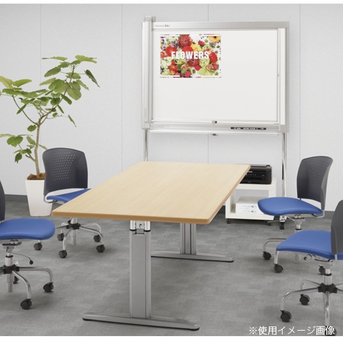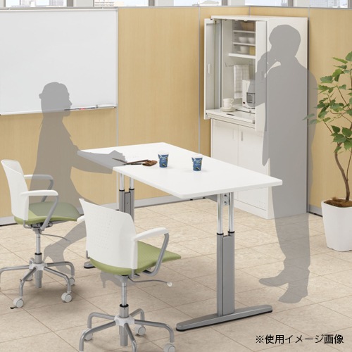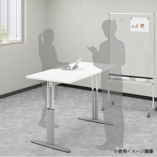 天板:メラミン化粧板 縁材:オレフィン系樹脂エッジ 脚:スチール丸パイプ(2連)、シルバーメタリック塗装、昇降機能付、アジャスター付 |