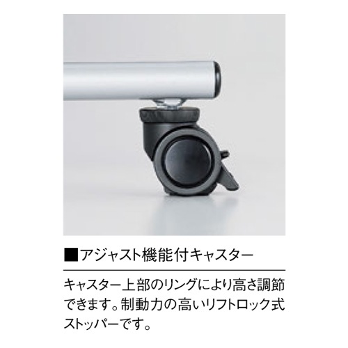 天板:表面材/メラミン化粧板 エッジ/ABS樹脂エッジ巻 30mm厚 脚部:支柱/70×25mmスチールパイプ ベース/54×28mmスチール楕円パイプ 焼付塗装 キャスター:直径50mm双輪ナイロンキャスター アジャスト機能4ヶ所(リフトロックストッパー4個) |