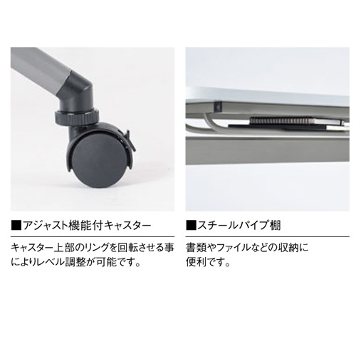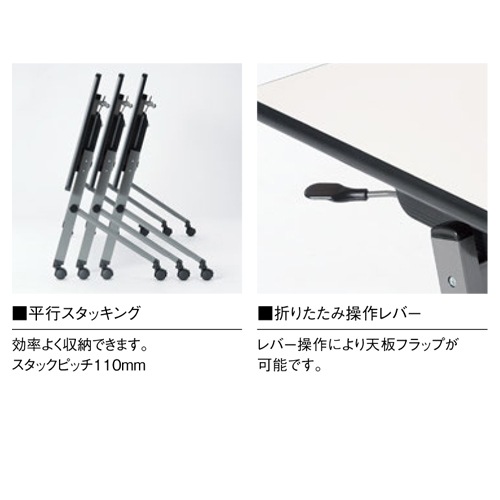 | 折りたたみ操作レバーで天板フラップが可能! キャスター付で移動も簡単なテーブルです。 平行にスタッキングでき、効率よく収納できます。 |