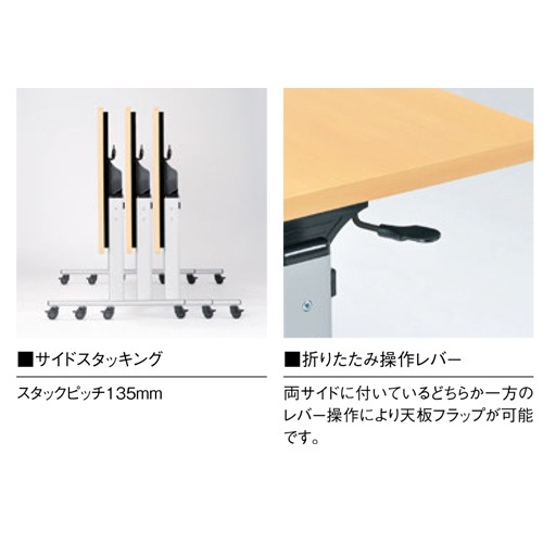 | 折りたたみ操作レバーで天板フラップが可能! キャスター付で移動も簡単なテーブルです。 135mmピッチでスタッキングでき、収納時も便利です。 オフィス、学校、施設で重宝されています。 |