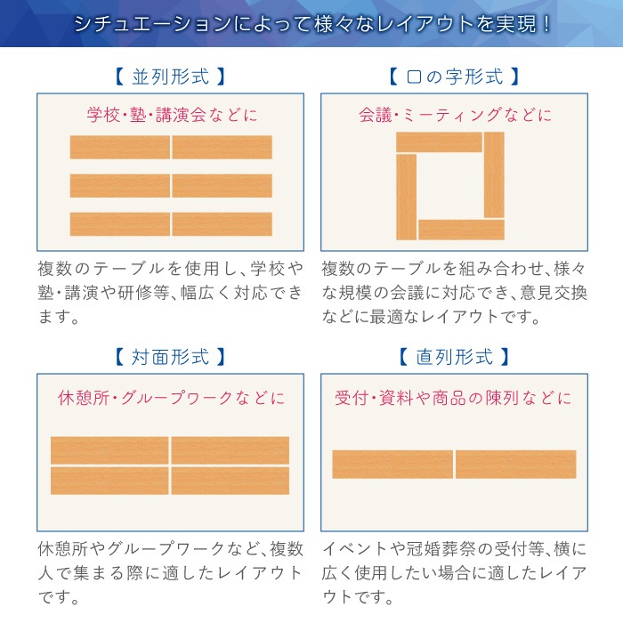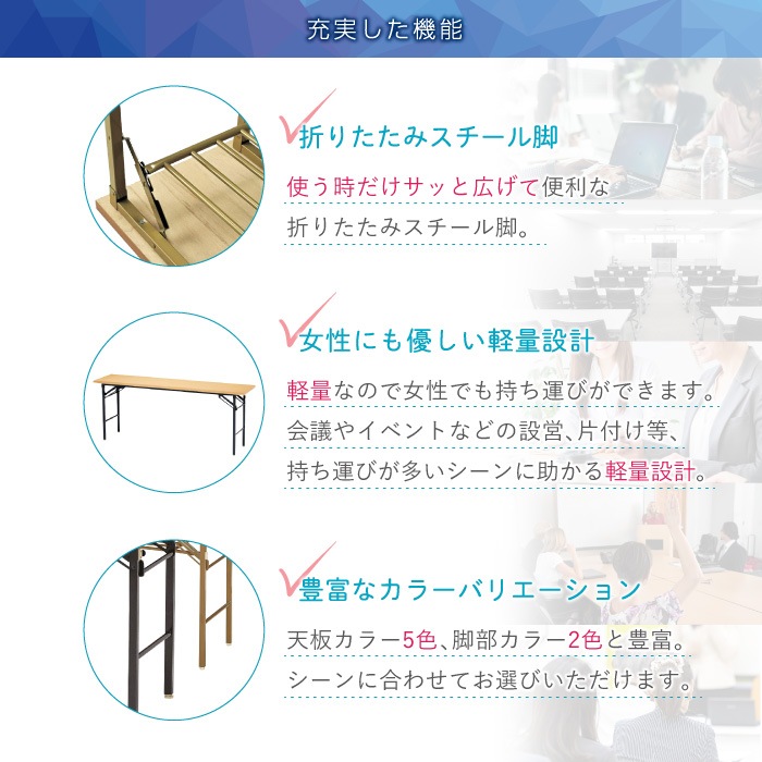 折りたたみが可能な定番会議テーブル! 会議やイベントなどの設営、移動、片付けなど、持ち運びが多いシーンに助かる軽量設計です。 収納時も折りたたんでコンパクトになり、省スペースで収納できます。 アジャスター付きでテーブルのガタつきを防止。 オフィス、学校、施設で重宝されています。 イベントの受付や作業台、休憩スペースなどにも活躍します。 |