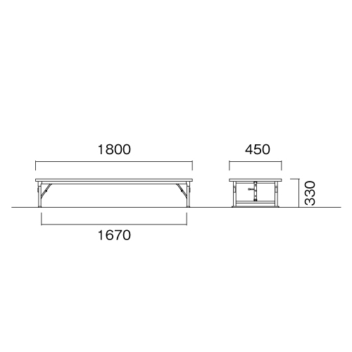 | サイズ | 外寸:幅1800×奥行450×高さ330mm 重量:10kg 脚間内寸:幅1670mm |