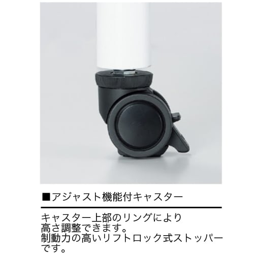 天板:表面材/メラミン化粧板 エッジ/ソフトエッジ巻 29mm厚 脚部:アルミダイキャスト スチールパイプ(直径42.7mm) ホワイト粉体塗装 直径50mm双輪ナイロンキャスター(リフトロックストッパー)×2 アジャスター×2 |