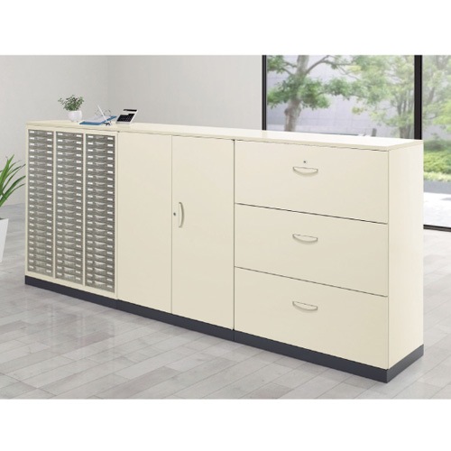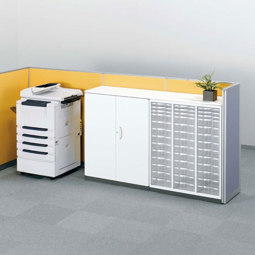 | 収納庫の上面にに取り付ける木製天板です。 天板をビスで固定する事で、収納庫をカウンターや窓下収納、各セクションの間仕切りとして利用できます。 |