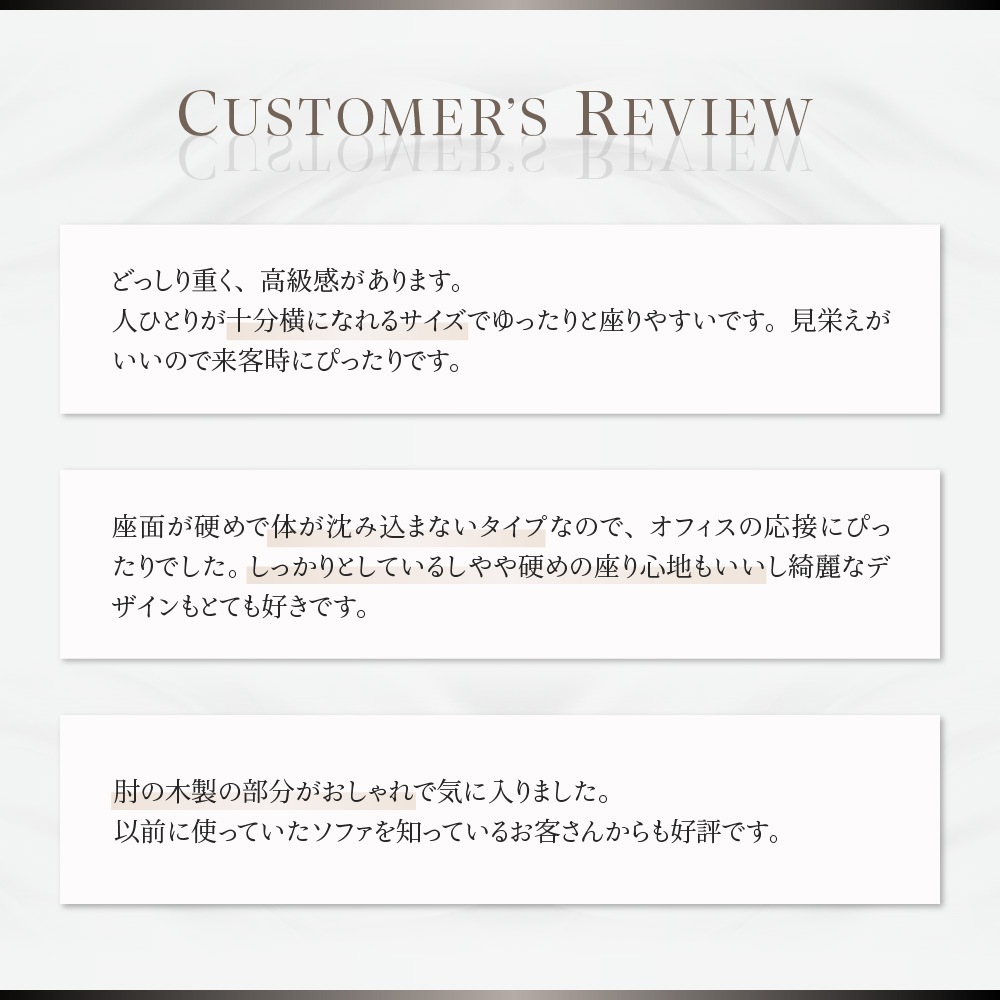 重厚な雰囲気を醸し出し、ソファー正面に天然木の飾り板を施した高級感のある応接セット。 アーム部分のカーブが座った際の圧迫感を軽減します。 厚みのあるしっかりしたフォルムで、ゆったりとリラックスできるソファです。 モダンでシックなデザインは高級感をより一層強く演出。オフィスの社長室や会議室はもちろん、高級ホテルのロビーなどにも映えるデザインです。 品格と深みのある質感が魅力のオリジナルソファに、センターテーブルを加えた応接4点セットです。 |