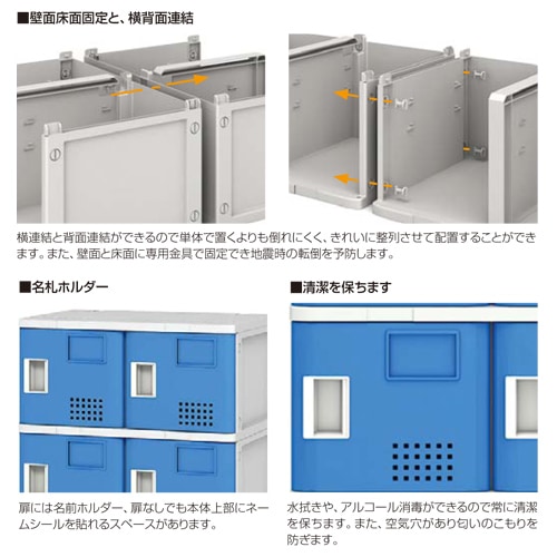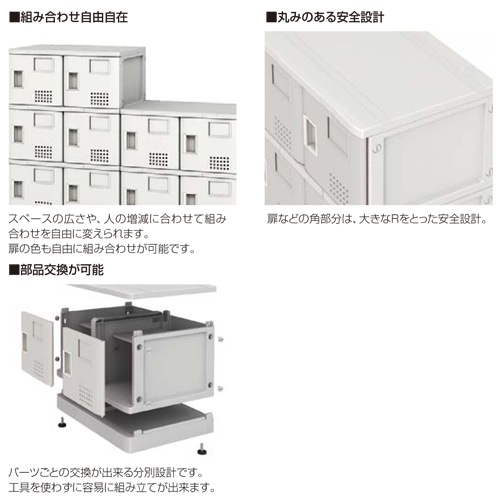 組み合わせ自由自在! 樹脂製の多目的ロッカーです。 錆びにくく、水拭きやアルコール消毒ができるので清潔を保てます。 人数やスペースに合わせて2列1段ごとに自由に組み合わせを変える事が可能です。 |