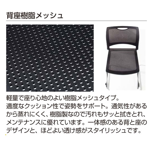 ほどよい透け感がスタイリッシュ! 軽量で座り心地のよい樹脂製のメッシュチェア4脚セットです。 床積みで8脚までスタッキング可能です。 通気性があるので蒸れにくく、長時間の会議も快適です。 樹脂製なので汚れもサッと拭き取れてメンテナンスに優れています。 |