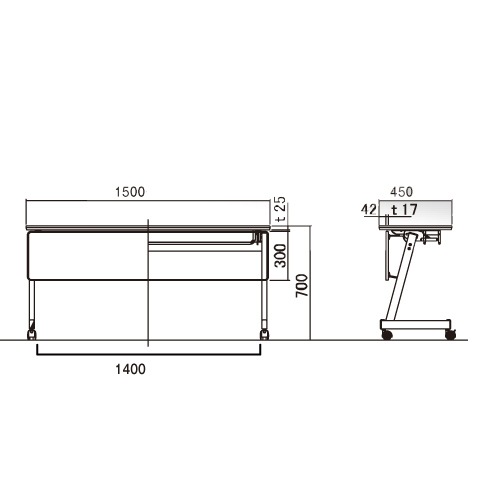 天板:24tメラミン化粧板 木口:PVCエッジ 幕板:ポリエステル化粧板 脚部:50×30mmスチールパイプ、メラミン焼付塗装 ●安全カバー兼用ロックレバー(両側) ●棚付 ●ストッパー付きキャスター |