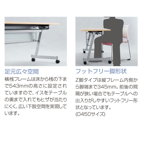 足元広々で快適な打合せ! 足元スペースに配慮した作りのフォールディングテーブルです。 床から浅下までの高さが543mmに設定されているので膝が当たりにくい、広い下肢空間を実現しています。 天板の跳ね上げに使用する安全カバー兼用のレバーは大型で操作性がよく、指詰め防止にも配慮されています。 収納ピッチは117mmとスリム収納設計になっています。 |
