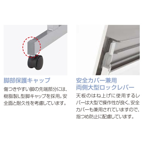 天板:24tメラミン化粧板 木口:PVCエッジ 幕板:ポリエステル化粧板 脚部:50×30mmスチールパイプ、メラミン焼付塗装 ●安全カバー兼用ロックレバー(両側) ●棚付 ●ストッパー付きキャスター |