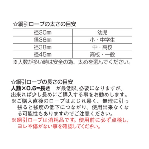 ※配送の注意事項がございます。詳細は下記表をご確認ください。 ※綱引ロープの長さの目安:人数×0.6=長さが最低限必要になりますが、出来れば少し長めにご購入する事をお勧めします。 ※ご購入直後のロープはよじれ易く、無理に引っ張ると強度の低下につながり、使用出来なくなる可能性もありますのでご注意ください。 ※綱引ロープは消耗品です。使用前に必ず点検し、ヨレや傷がない事を確認してください。 |