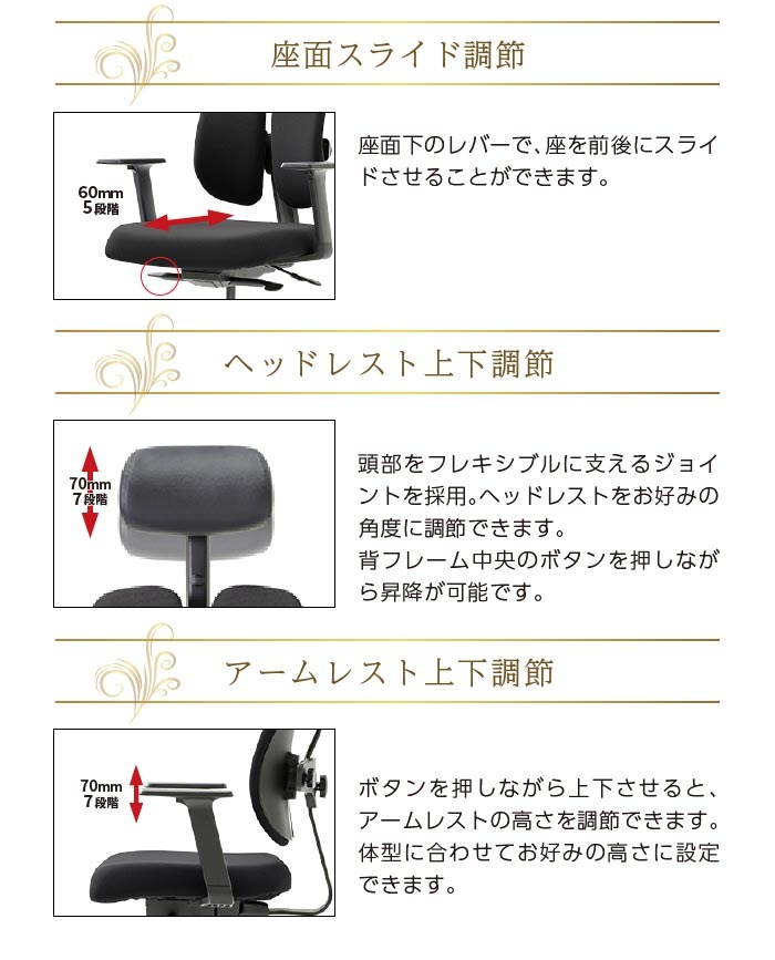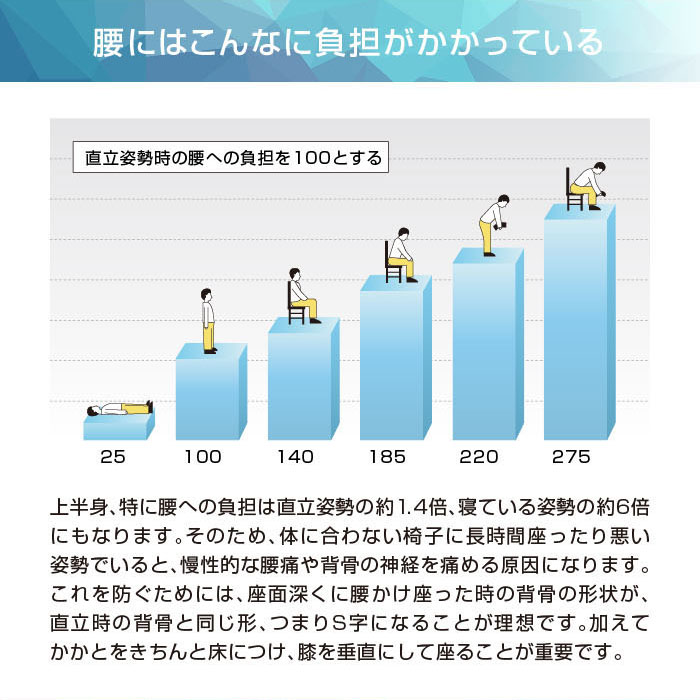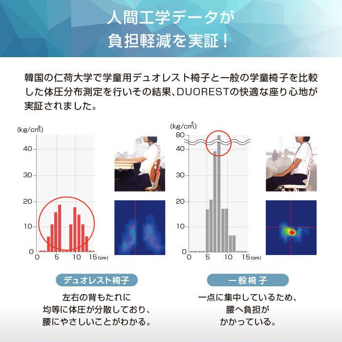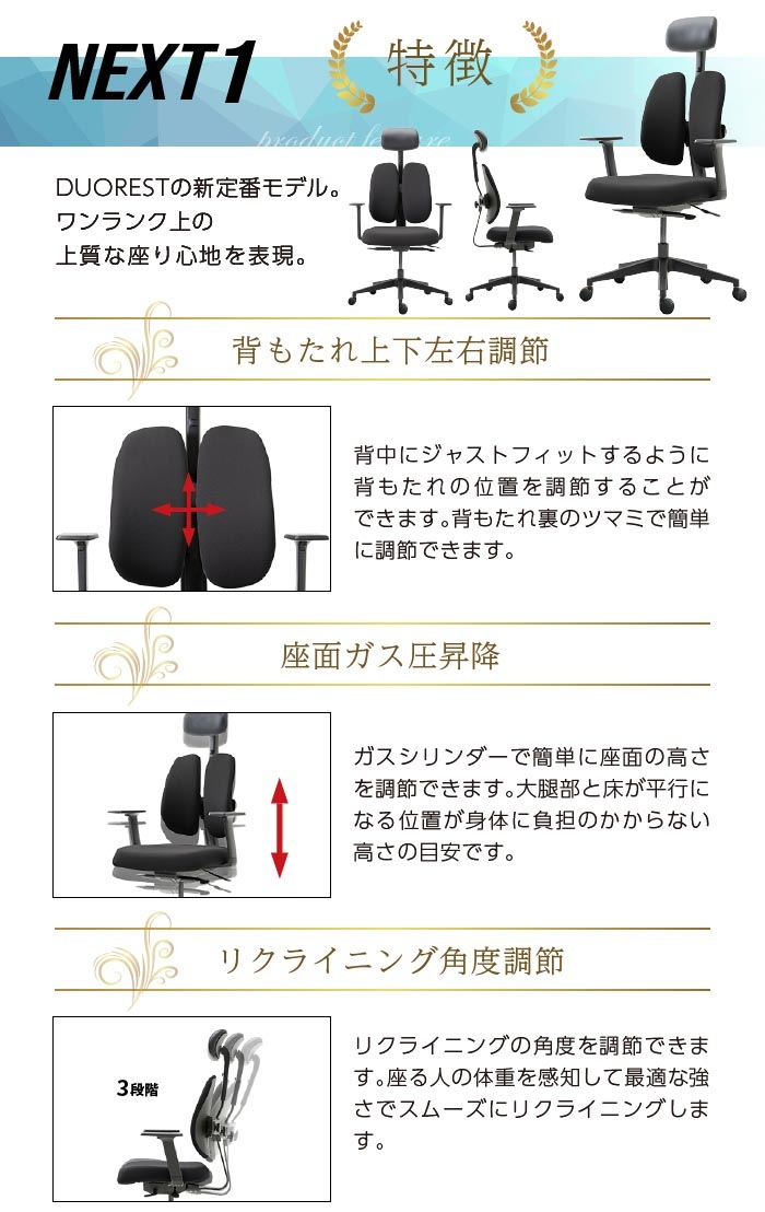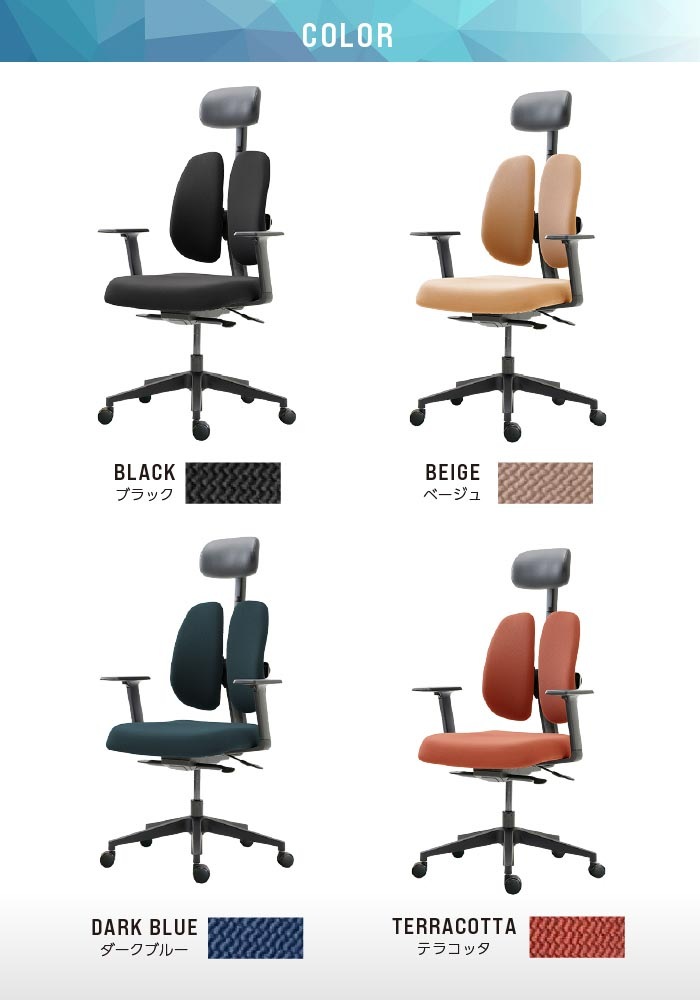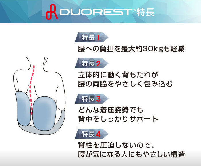 長時間の座り仕事をする方や、腰痛でお悩みの方に! デュオレスト理論に基づいて製品化されたオフィスチェアです。 立体的に動く2つの背もたれが腰の負担を和らげ、自然と背筋を伸ばしてくれます。 シンプルなデザインでオフィスから個人の方まで幅広くご使用頂けます。 |