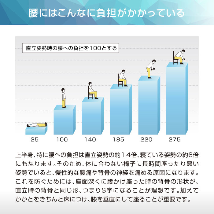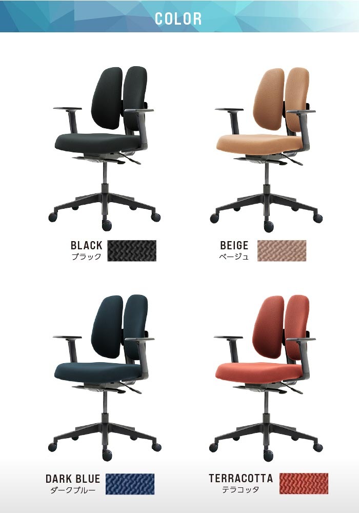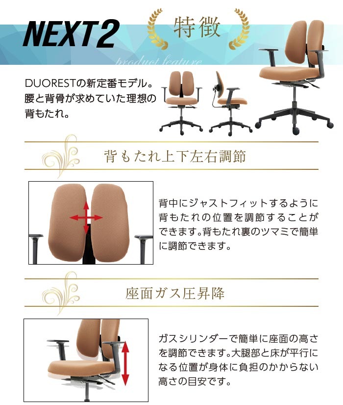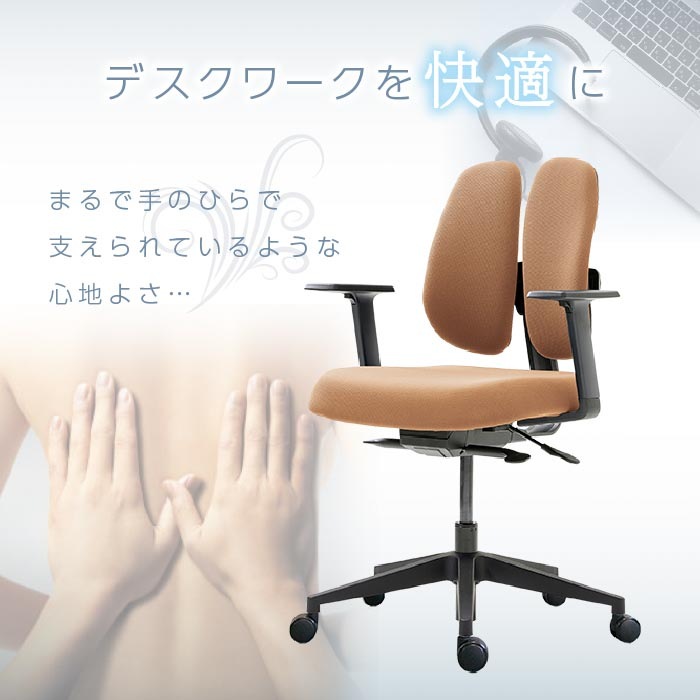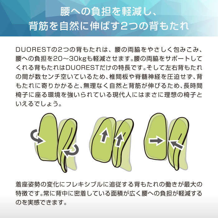 長時間の座り仕事をする方や、腰痛でお悩みの方に! デュオレスト理論に基づいて製品化されたオフィスチェアです。 立体的に動く2つの背もたれが腰の負担を和らげ、自然と背筋を伸ばしてくれます。 シンプルなデザインでオフィスから個人の方まで幅広くご使用頂けます。 |