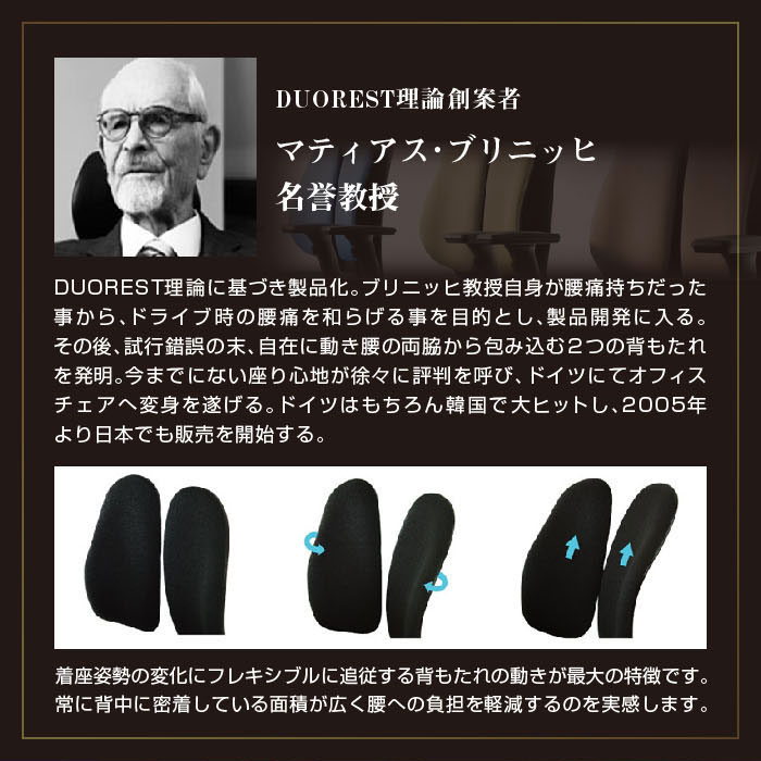 | DUOREST 椅子 腰痛解消 腰痛軽減 腰痛対策 サポート ミドルバック ハイバック 高機能チェア パソコン PC 作業 事務 仕事 座り仕事 マティアス・ブリニッヒ教授 DR-250SP | |