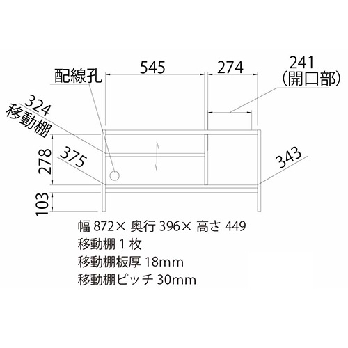幅872×奥行396×高さ449mm 天板耐荷重:15kg 棚板耐荷重:7kg 棚板移動ピッチ:30mm テレビサイズ目安:32V |