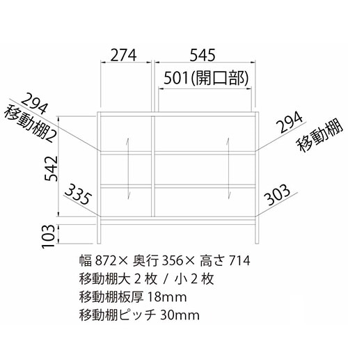 幅872×奥行356×高さ714mm 天板耐荷重:15kg 棚板耐荷重:7kg 棚板移動ピッチ:30mm 移動大棚耐荷重:7kg 移動小棚耐荷重:5kg |