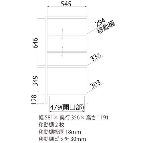 幅581×奥行356×高さ1191mm 天板耐荷重:10kg 棚板耐荷重:7kg 棚板移動ピッチ:30mm |