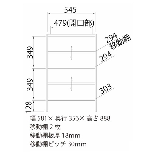 幅581×奥行356×高さ888mm 天板耐荷重:10kg 棚板耐荷重:7kg 棚板移動ピッチ:30mm |