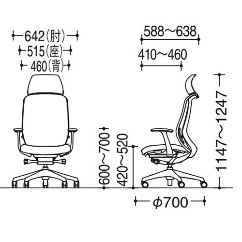 外寸:幅642×奥行588~638×高さ1147~1247(座面高420~520)mm 肘高さ:600~700mm 脚外径:直径700mm |