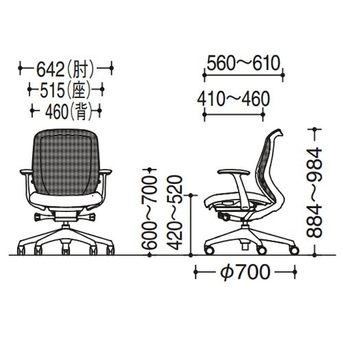 外寸:幅642×奥行560~610×高さ884~984(座面高420~520)mm 肘高さ:600~700mm 脚外径:直径700mm |