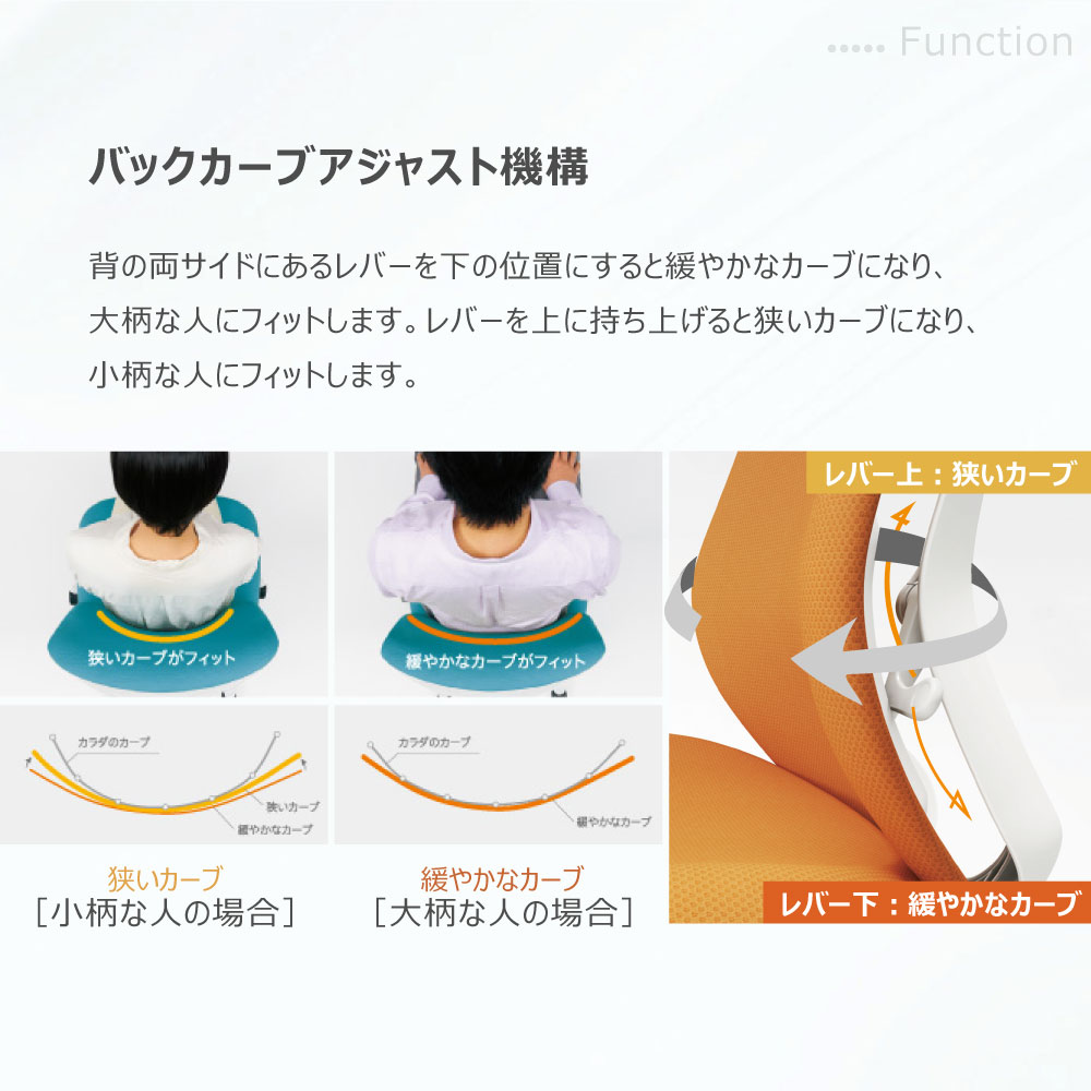 カラダにあわせて、まるで手を添えて包み込まれるような優しい座り心地 働くひとりひとりにフィットする、これからのオフィスにふさわしいスタンダードシリーズです。 美しさと強度を兼ね備えたフレームやお尻を包み込む座面のゆるやかなカーブが特徴。 カラダと背もたれのフィット感を向上させるバックカーブアジャスト機構で、背もたれのカーブを簡単に調節。 座面左下のダイヤルでリクライニングの固定と解除、ダイヤル操作でリクライニングの強弱調整が行えます。 |