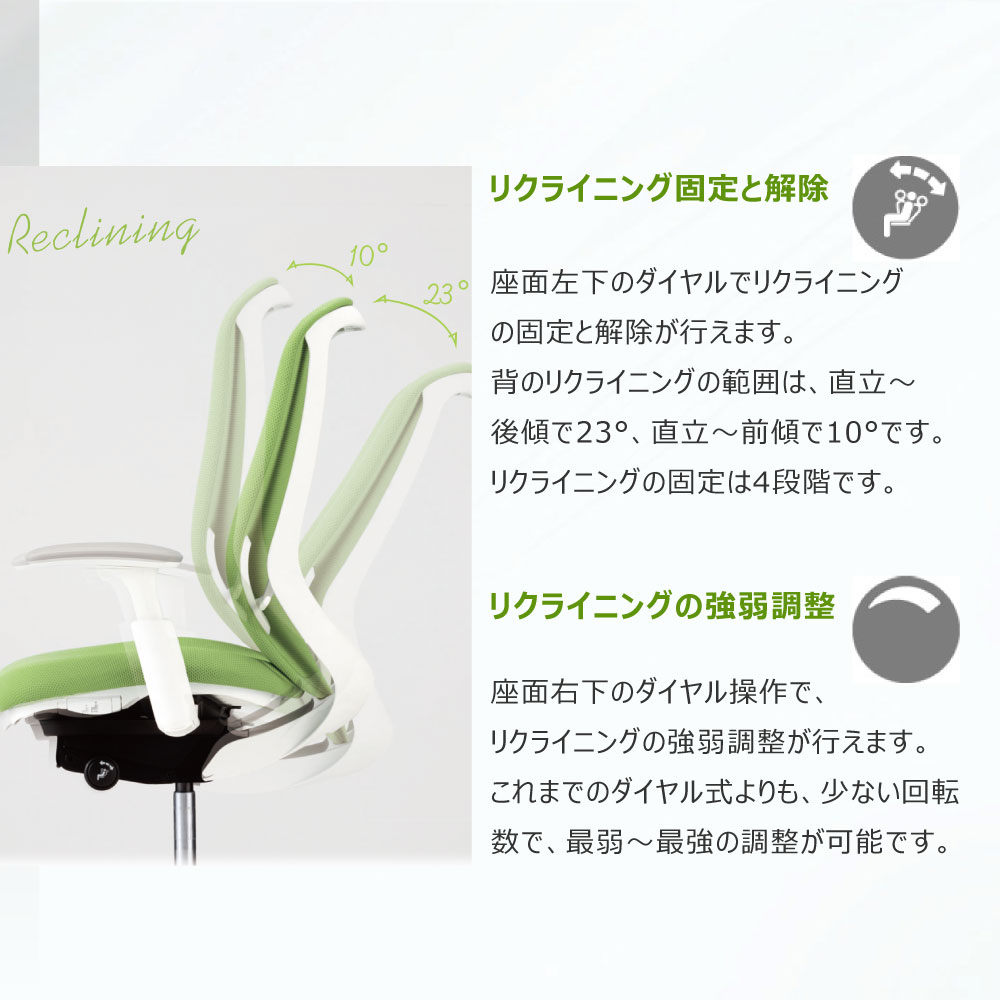 従来の直立姿勢から後傾姿勢までのリクライニングに加え、 パソコン作業や筆記作業に適した前傾ポジションをとることが可能です。 おなかの圧迫が解消され、腰の負担が軽減されます。 リクライニングの強弱調整 座面右下のダイヤル操作で、リクライニングの強弱調整が行えます。 これまでのダイヤル式よりも、少ない回転数で、最弱~最強の調整が可能です。 |
