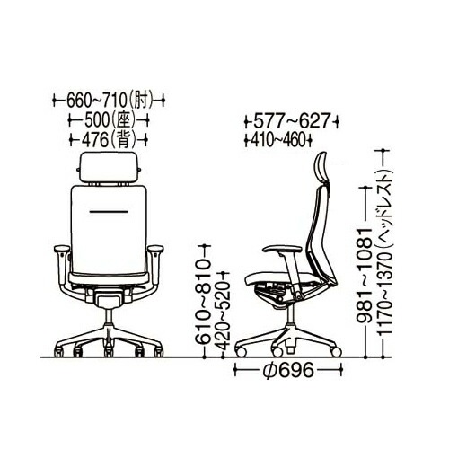 外寸:幅660~710×奥行577~627×高さ1170~1370(座面高420~520)mm 肘高:高さ610~810mm 脚外径:直径696mm |