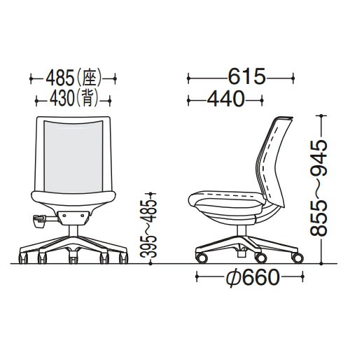 外寸:幅485×奥行615×高さ855~945(座面高395~485)mm 脚外径:直径660mm |
