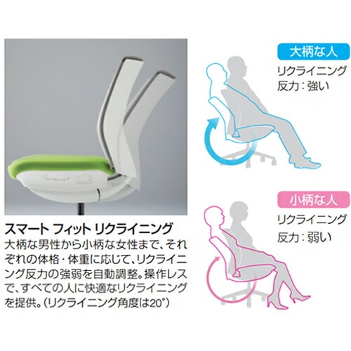 働き方は人それぞれ、シーンを選ばない椅子! スマートフィットリクライニングとエラストマーバックの採用で、 人それぞれに合わせた快適な座り心地を実現しました。 これからのワークスタイルに、働き方にフィットする、座る人を選ばないマルチパーパスシーティングの誕生です。 大柄な方から小柄な方まで、それぞれの体格・体重に応じてリクライニング反力の強弱を自動調整。 操作レスですべての人に快適なリクライニングを提供します。 |