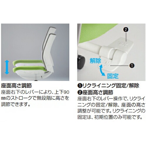 背・座アウターシェル/樹脂成型品(PP) 背マット/樹脂成型品 背・座布/ポリエステル100%(再生ポリエステル62%含む) 脚/樹脂成型品(PA) キャスター/ナイロン ●スマートフィットリクライニング(リクライニング角度20度) ●リクライニング固定・解除 ●座面高さ調節(上下90mm) ●日本製 |