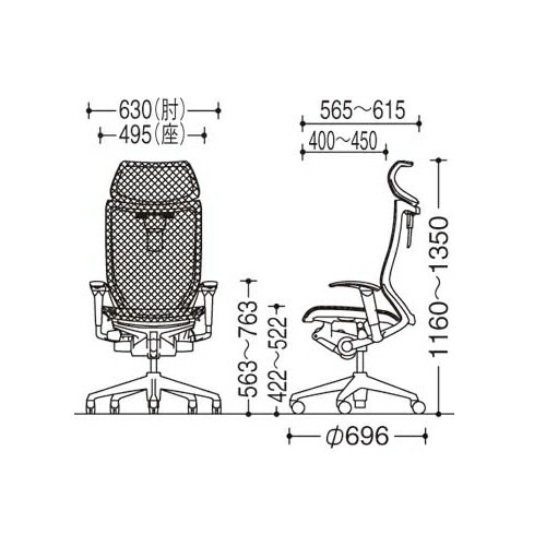 幅630×奥行696×高さ1160~1350(座面高422~522)mm 肘高さ:563~763mm |