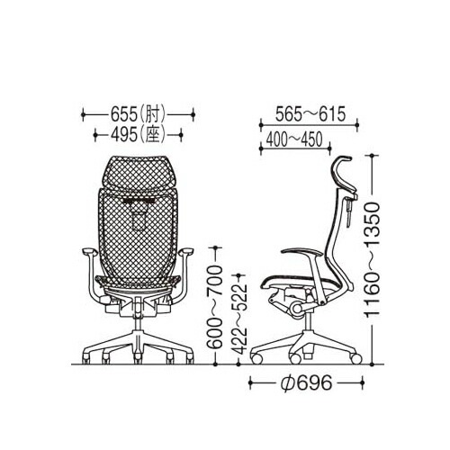 幅655×奥行696×高さ1160~1350(座面高422~522)mm 肘高さ:603~703mm |
