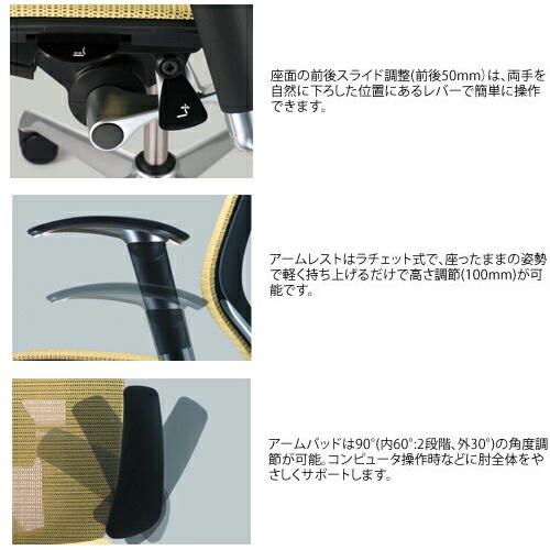 背フレーム/アルミダイキャスト 肘パッド/熱可塑性ポリウレタン デザインアーム/アルミダイキャスト 脚/アルミダイキャスト キャスター/直径60mmナイロン双輪キャスター ●アンクルチルトリクライニング ●リクライニングの固定・解除 ●リクライニング強弱調整 ●座面高さ調整(ストローク100mm) ●座面奥行き調整(ストローク50mm) ●日本製 |