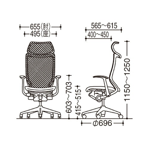 幅655×奥行696×高さ1150~1250(座面高415~515)mm 肘高さ:600~700mm |