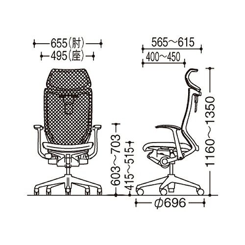 幅655×奥行696×高さ1160~1350(座面高415~515)mm 肘高さ:603~703mm |