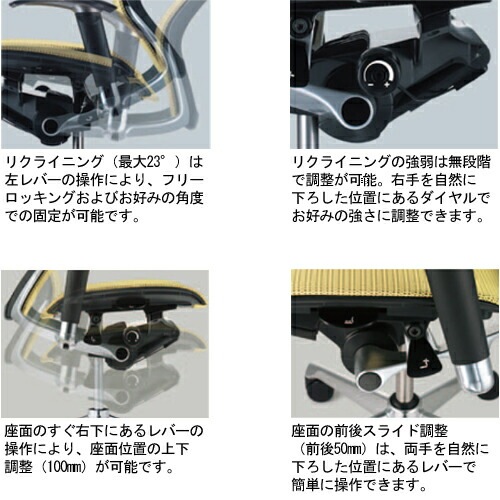 背フレーム/アルミダイキャスト 脚/アルミダイキャスト キャスター/直径60mmナイロン双輪キャスター ●アンクルチルトリクライニング ●リクライニングの固定・解除 ●リクライニング強弱調整 ●座面高さ調整(ストローク100mm) ●座面奥行き調整(ストローク50mm) ●日本製 |