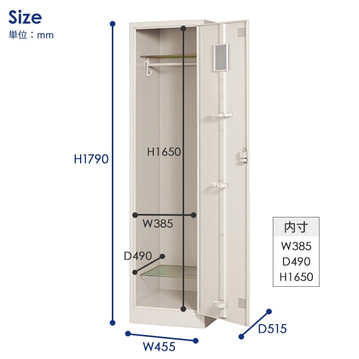 | サイズ | 外寸:幅455×奥行515×高さ1790mm 1室内寸:幅385×奥行490×高さ1650mm 重量:24.4kg |