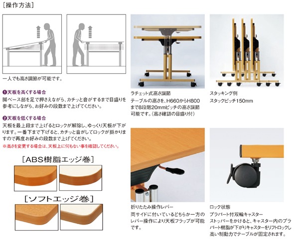 天板:表面材/メラミン化粧板 エッジ/ソフトエッジ巻 28mm厚 脚部:支柱/スチールパイプ(直径42.7mm) ベース/スチールパイプ(60×30mm) 焼付塗装 ラチェット昇降式(20mmピッチ7段階切替) 直径50mm双輪ナイロンキャスター アジャスト機能4ヶ所(リフトロックストッパー4個) ・日本製