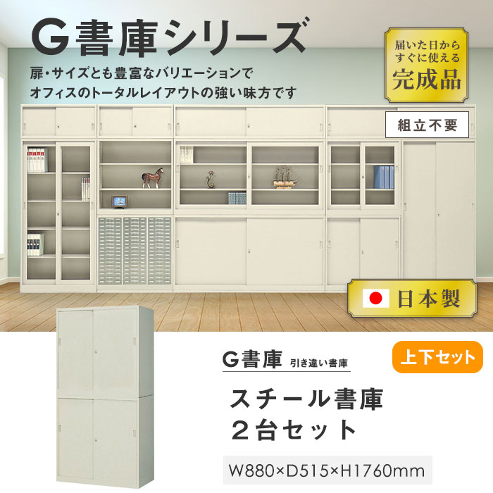 - 引戸キャビネット 書庫上下セット スチール 鍵付き 幅880×奥行515×高さ1760mm G-335SSS