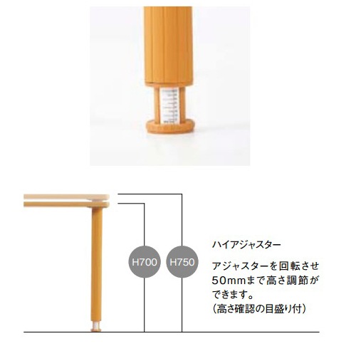 | 打ち合わせや休憩スペースにも大人気! アジャスター付きで高さ調節可能なダイニングテーブルです。 高さは700~750mmまで最大50mm調整ができます。 オフィス・福祉施設・介護老人ホーム等で重宝されています。 |
