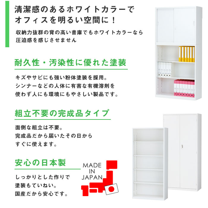 | 中が見えるから整理も簡単!組立不要の完成品書庫! ファイルや書類、カタログ等の収納に最適な収納庫です。 |