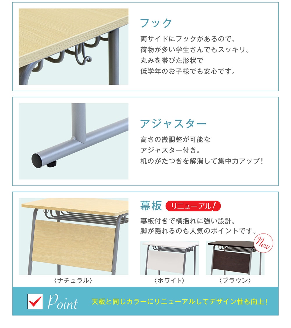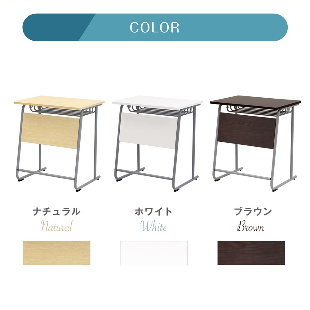 学習塾や教育施設で大人気! 頑丈でシンプル&コンパクトな使いやすいデスクです。 網棚や両サイドにフックがついていて、テキストをしまったりバッグをかけたり出来るので使い勝手も抜群! 軽くて移動もしやすいサイズは、セミナーなど頻繁にレイアウト変更を行う場所はもちろん、ご家庭でのリビング学習にもおすすめです。 |