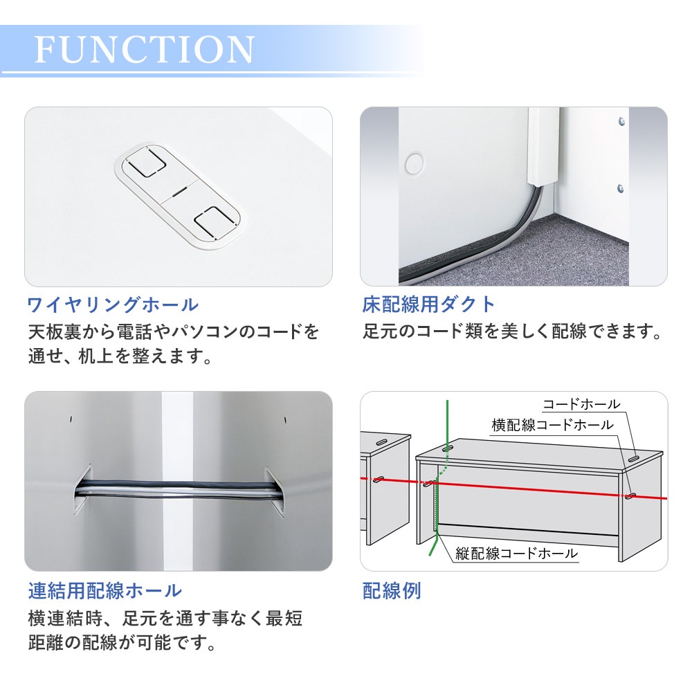 天板:メラミン化粧板、ソフトエッジ巻 本体:スチール製、粉体塗装 アジャスター付、横連結式 |