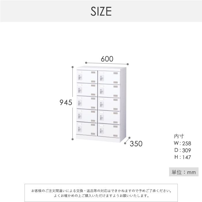 - シューズロッカー 10人用 2列5段 シリンダー錠 鍵付き SLBW-M10-S2