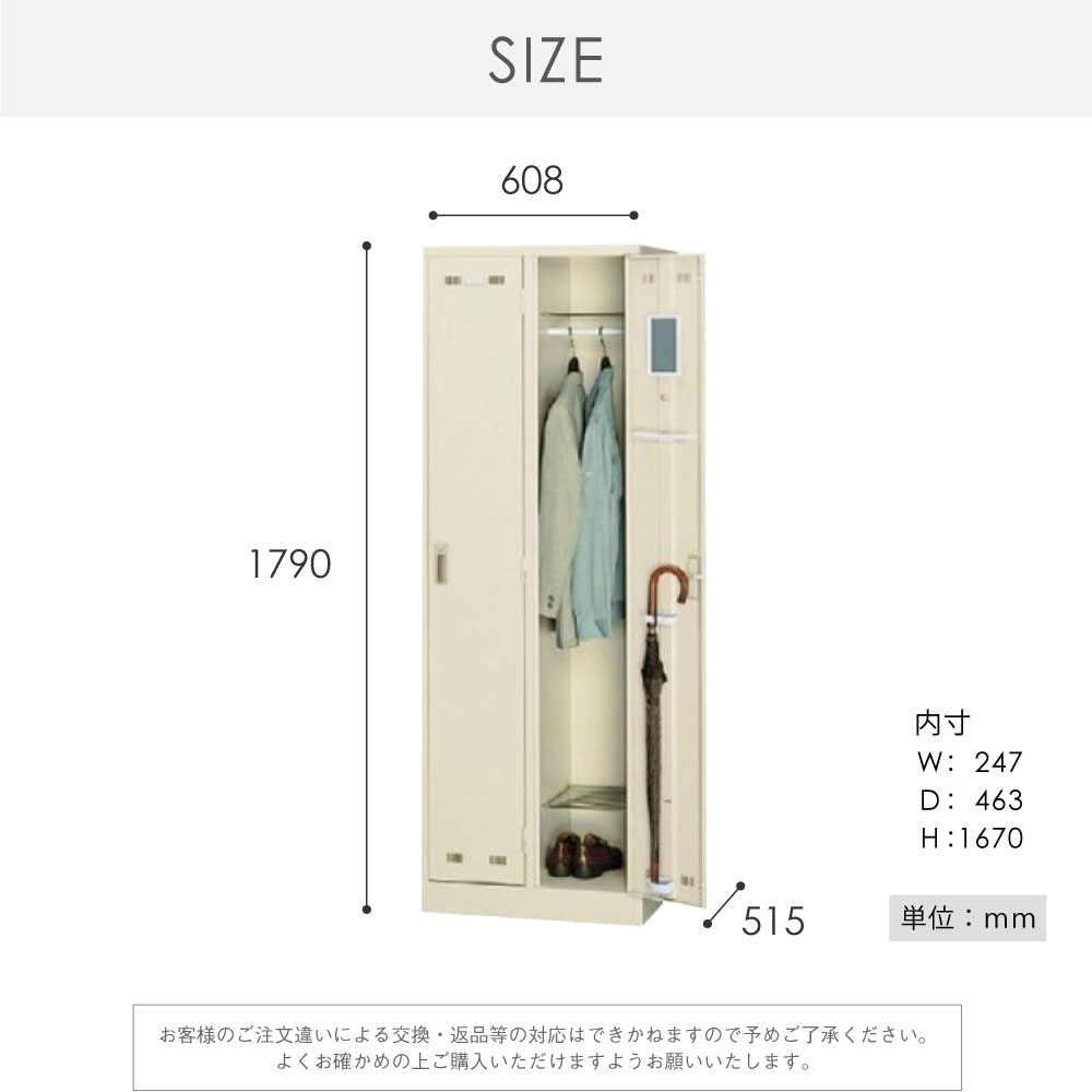 | サイズ | 外寸:幅608×奥行515×高さ1790mm 有効内寸:幅247×奥行463×高さ1670mm 重量:32kg ハンガーパイプ耐荷重:20kg 網棚耐荷重:10kg |