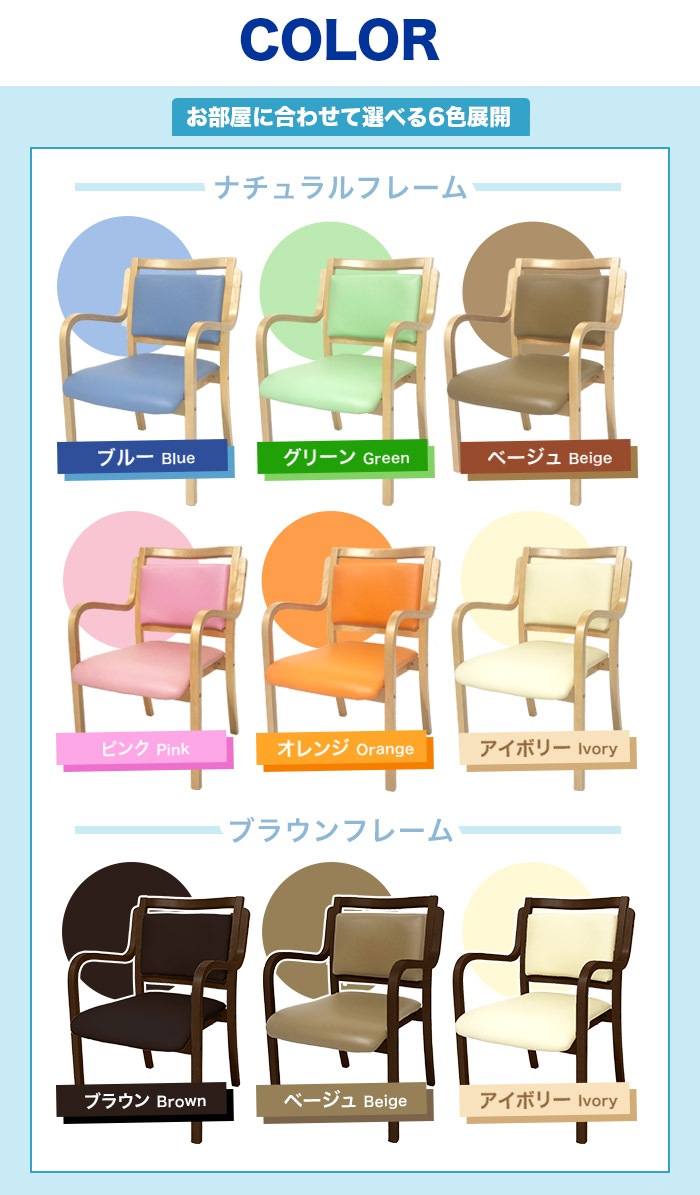 安定感があり、立ち座りを優しくサポートする木製ダイニングチェア。 R加工の施されたフレームが握りやすく、肘部分には若干の角度をつけることでより安定した座り心地を実現しました。 背もたれに付いた持ち手が移動時などの持ち運びに便利です。 張地は水や汚れに強いPVCレザーを採用。汚れてもサッと拭き取るだけでお手入れが簡単にできます。 4脚までスタッキング可能なので収納にも便利。 フローリングなどの床面を保護するフェルトシート付きで安心してご使用いただけます。 カラフルな家具はお部屋の雰囲気を明るくし、また視認性も高まるので転倒やつまずき防止にもつながります。 届いたその日からすぐに使える完成品です。 |