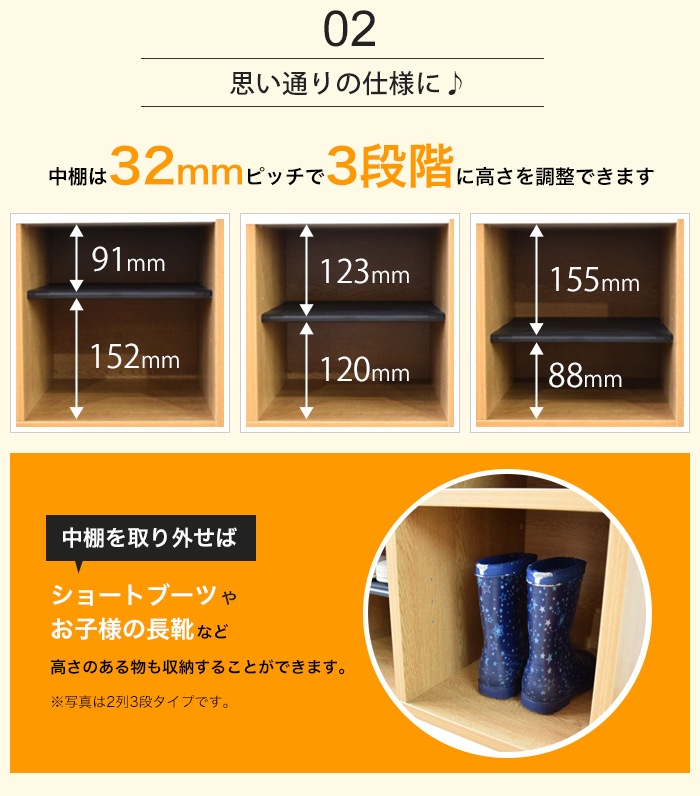 マルチに使える木製ラック! スリッパラックとして使用する際は、中棚付きなので外靴とスリッパをまとめて収納することができます。 中棚は32mmピッチで3段階に調節することができ、収納物に合わせて高さ調整することができます。 中棚を取り外せばお洒落な木目の収納棚として使用することができ、ショートブーツやお子さまの長靴など高さのあるものも収納することができます。 |