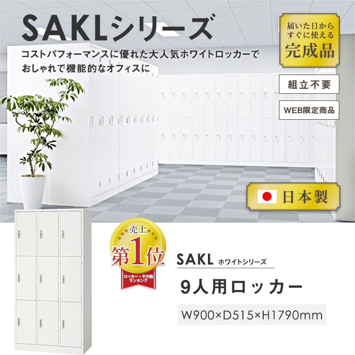 - ロッカー 9人用 3列3段 ホワイト 鍵付き 日本製 AKL-W9 オフィス家具
