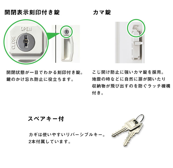 本体・扉:スチール、粉体塗装 取手:ABS樹脂、開閉表示刻印付きシリンダー錠 |