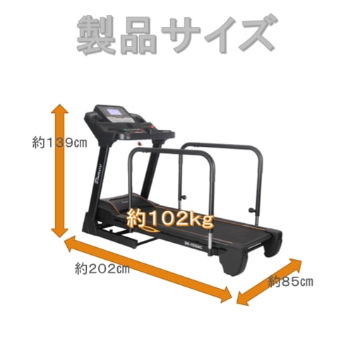 | サイズ | 本体:幅85×長さ202×高さ139cm 重量:102kg 走行面:幅53×長さ151×厚さ0.2cm 手摺:65~95cm(6段階) 体重制限:140kg 梱包サイズ:幅89×長さ230×高さ51cm 重量:134kg |